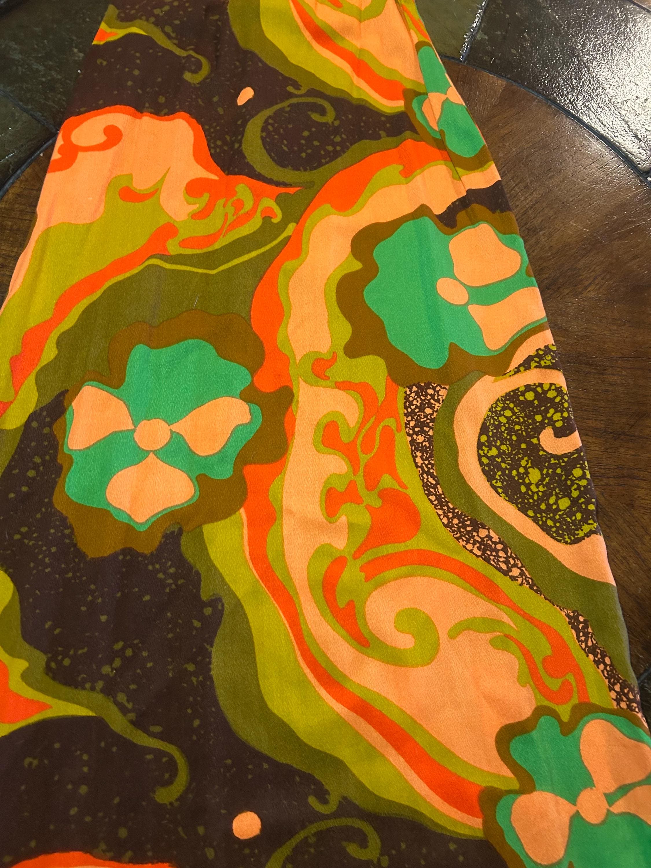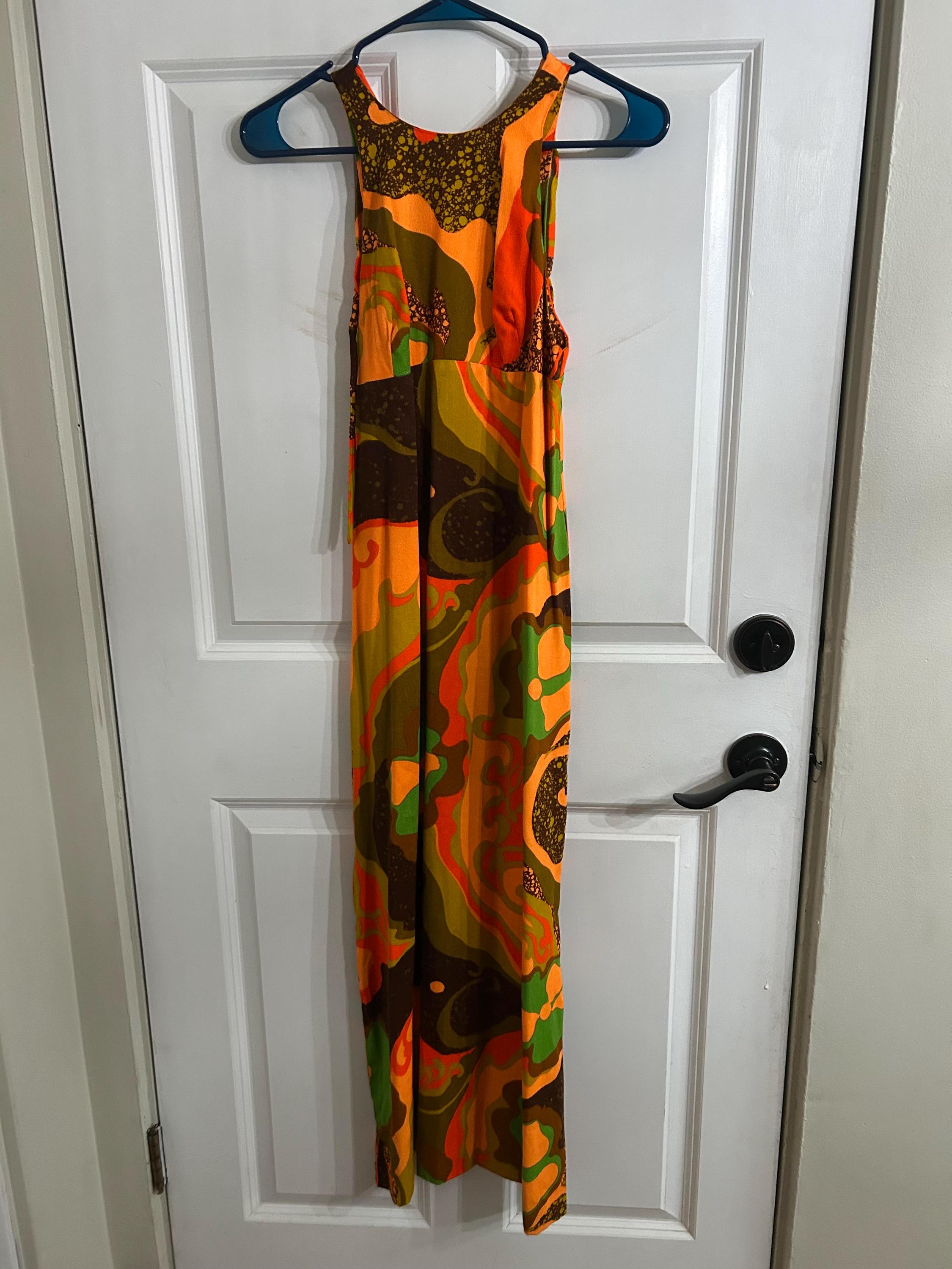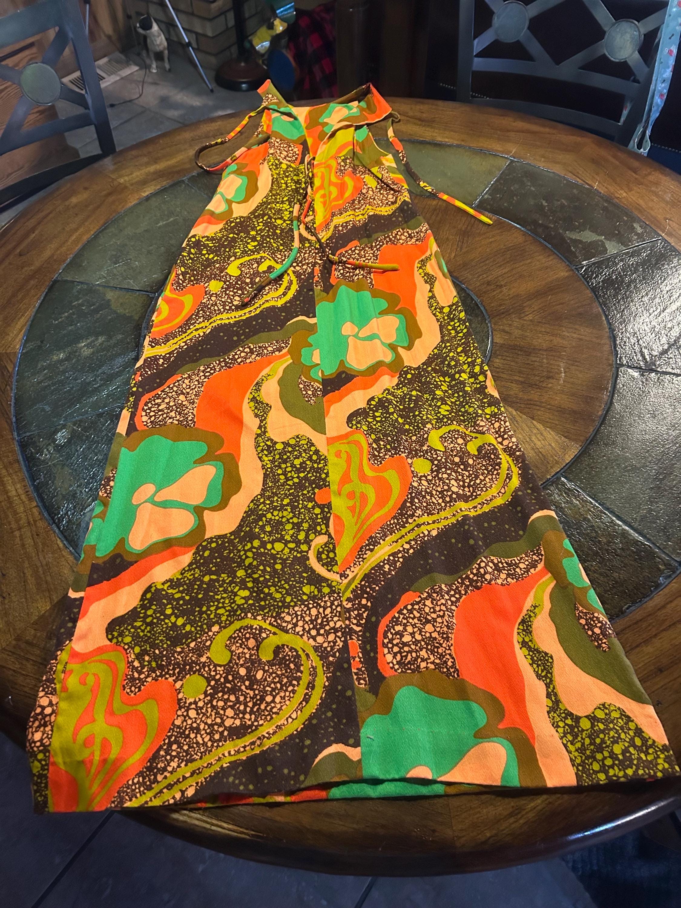 Great condition, halter style maxi in cool orange, green and brown colors reminscent of the 1960-1970's era!