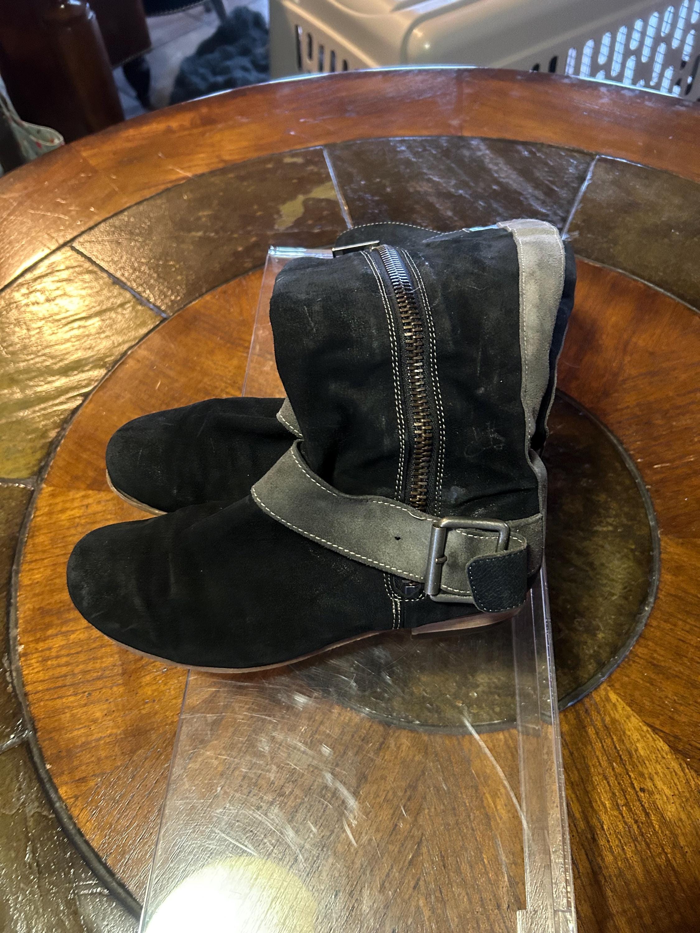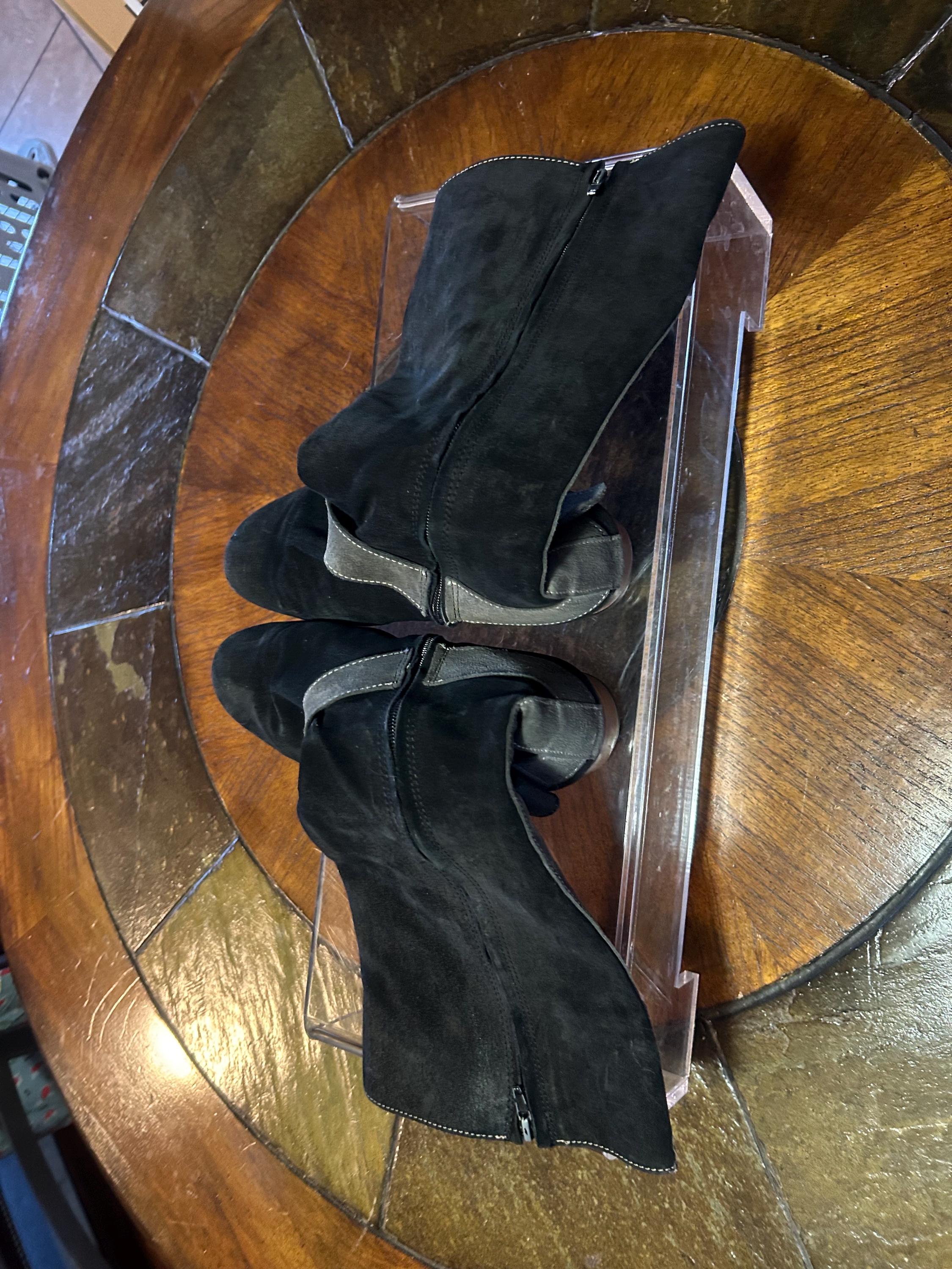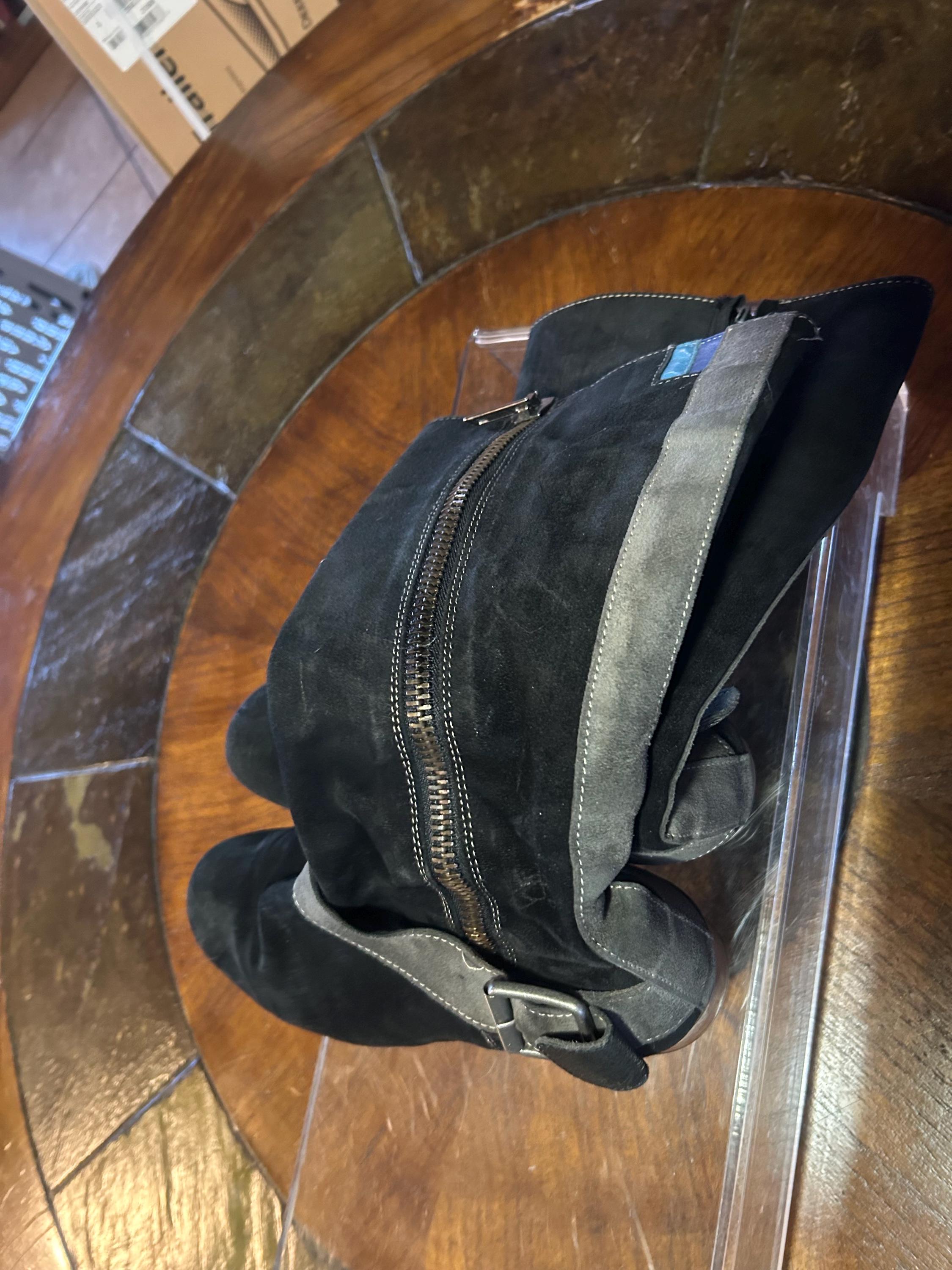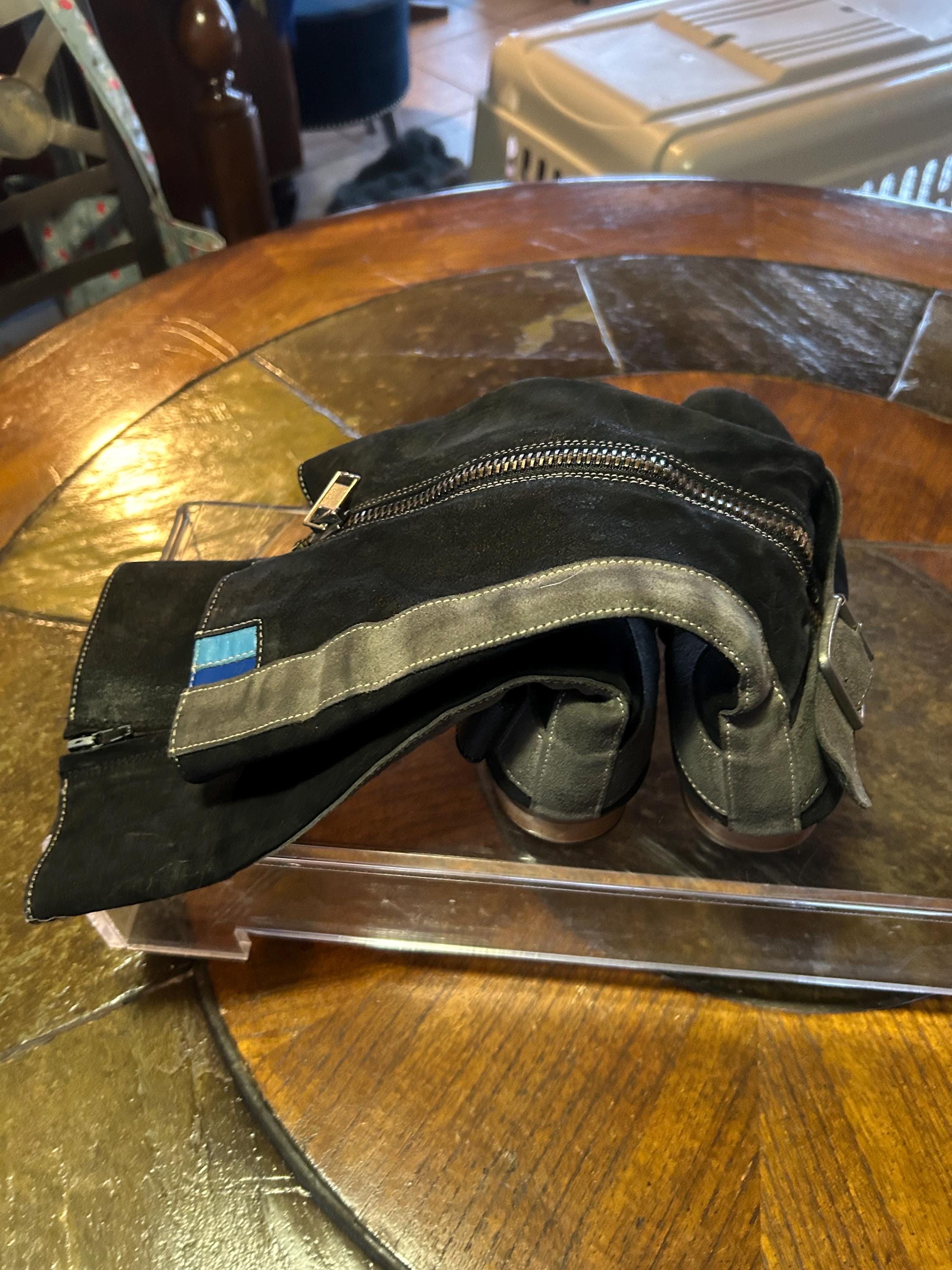Vintage John Fluevog size 7 tall suede boots, gray side buckle has a gray suede matching piece from top to bottom on back, double side zippers, interior bright blue leather, approximately 1" heel. Black suede with a cool double blue color piece on top on the boot.