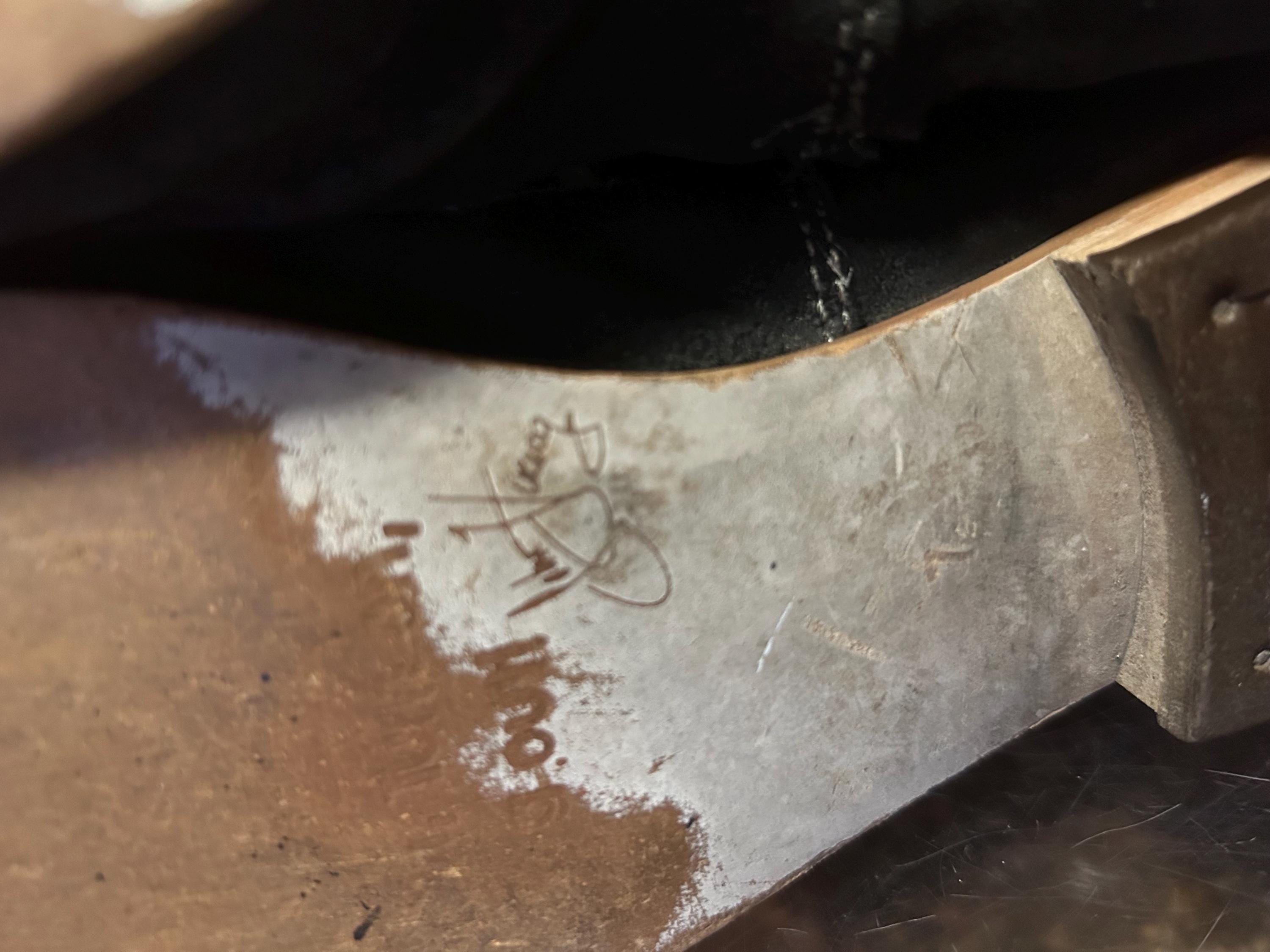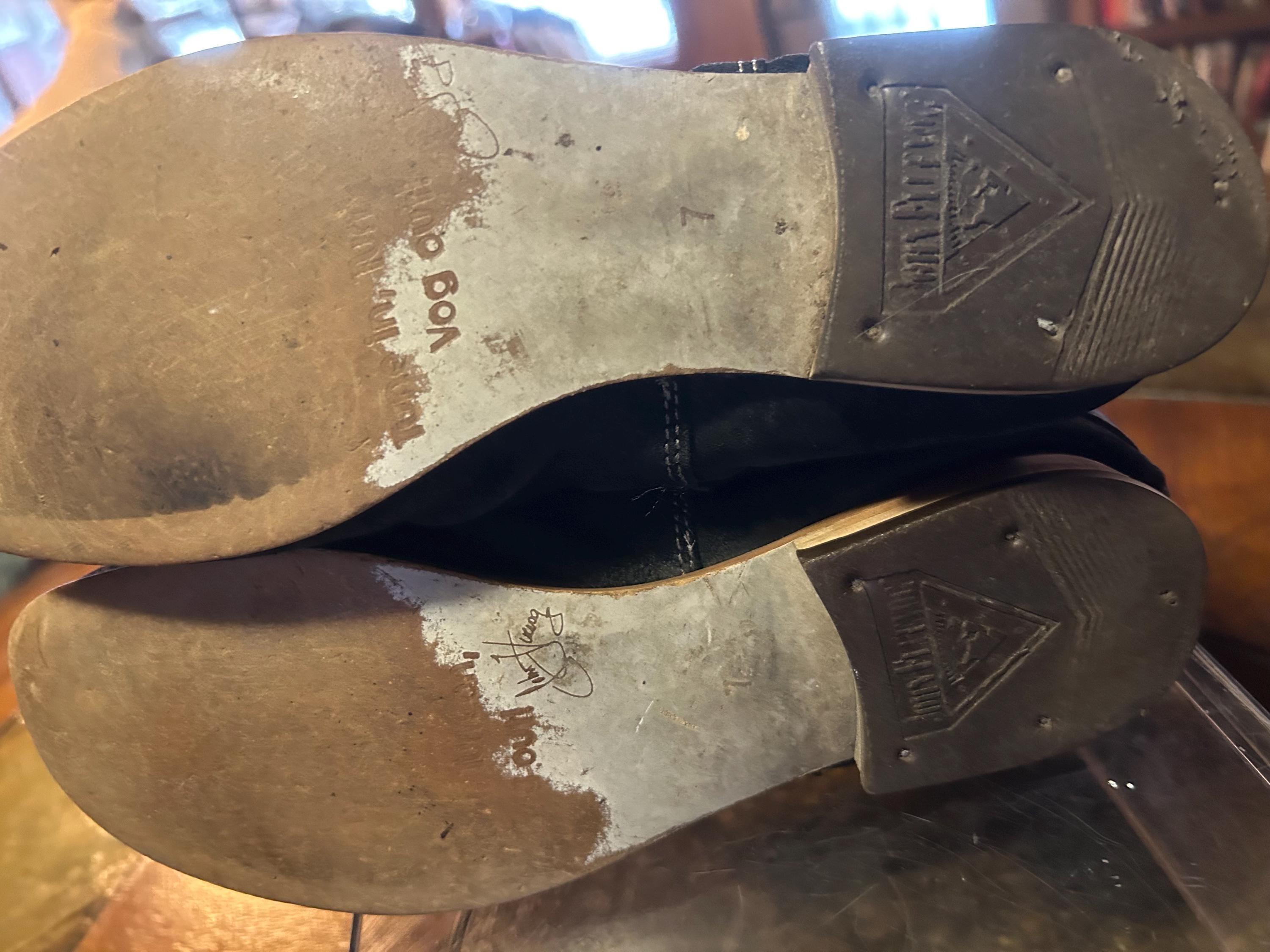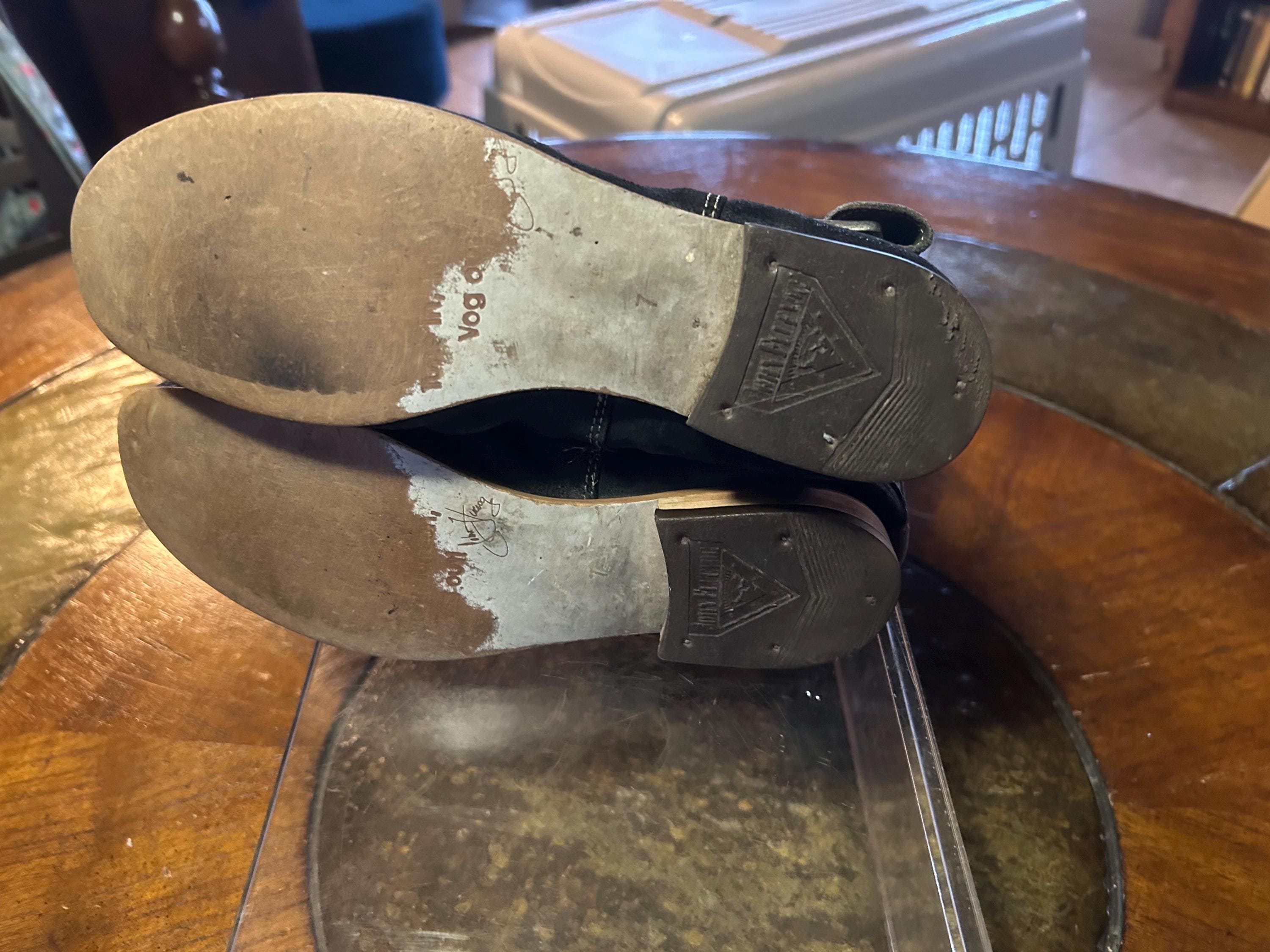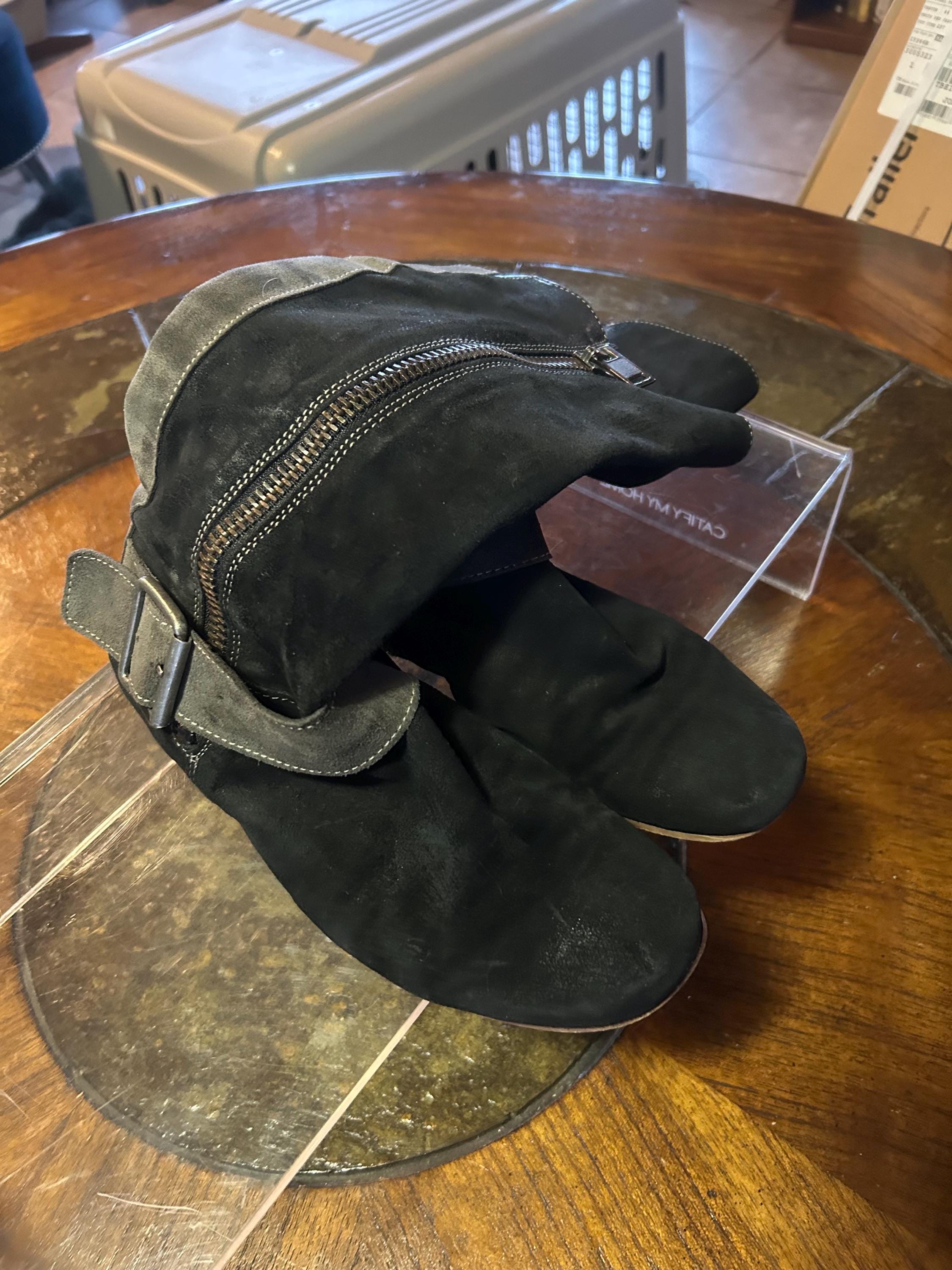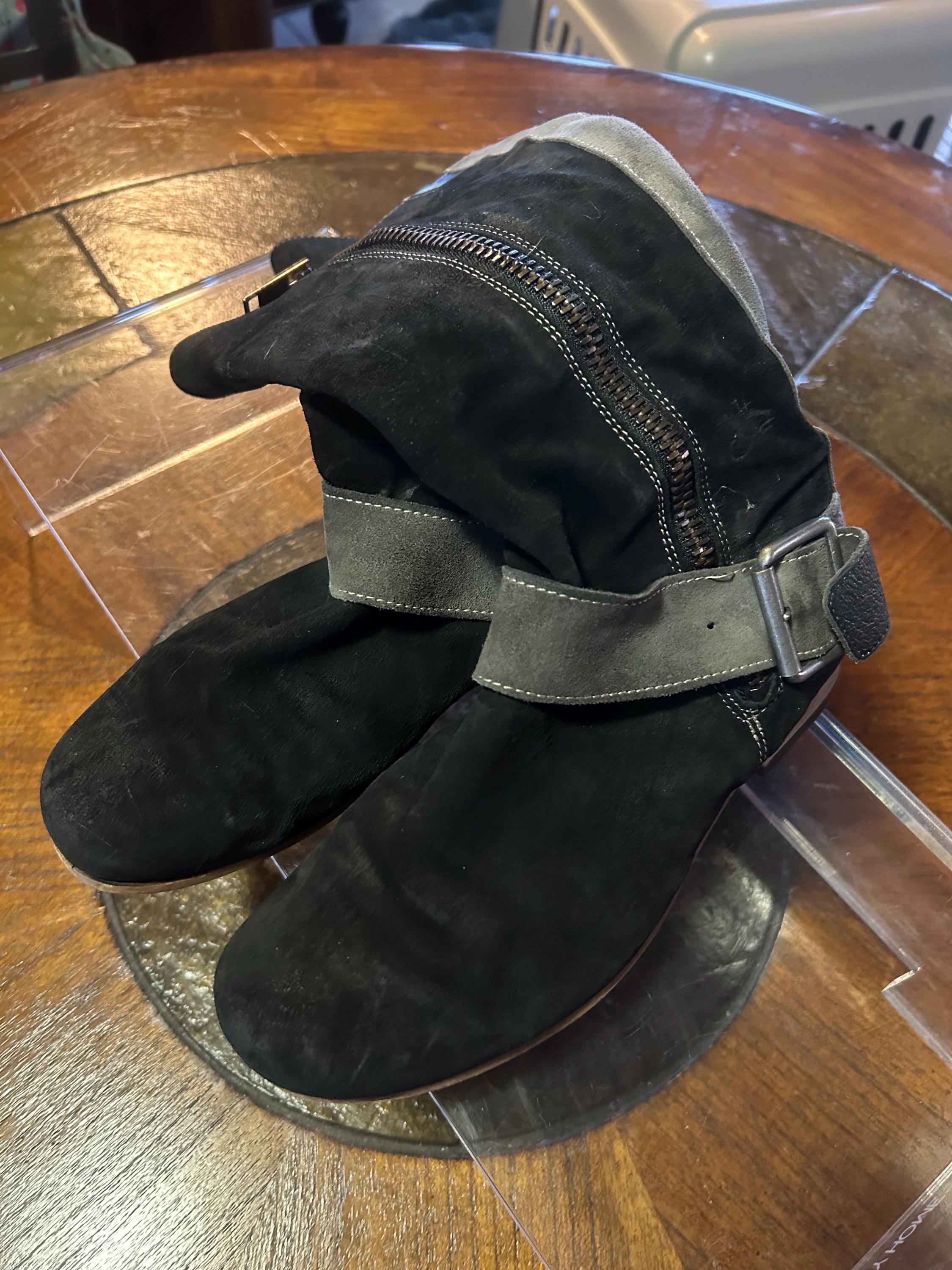Vintage John Fluevog size 7 tall suede boots, gray side buckle has a gray suede matching piece from top to bottom on back, double side zippers, interior bright blue leather, approximately 1" heel. Black suede with a cool double blue color piece on top on the boot.