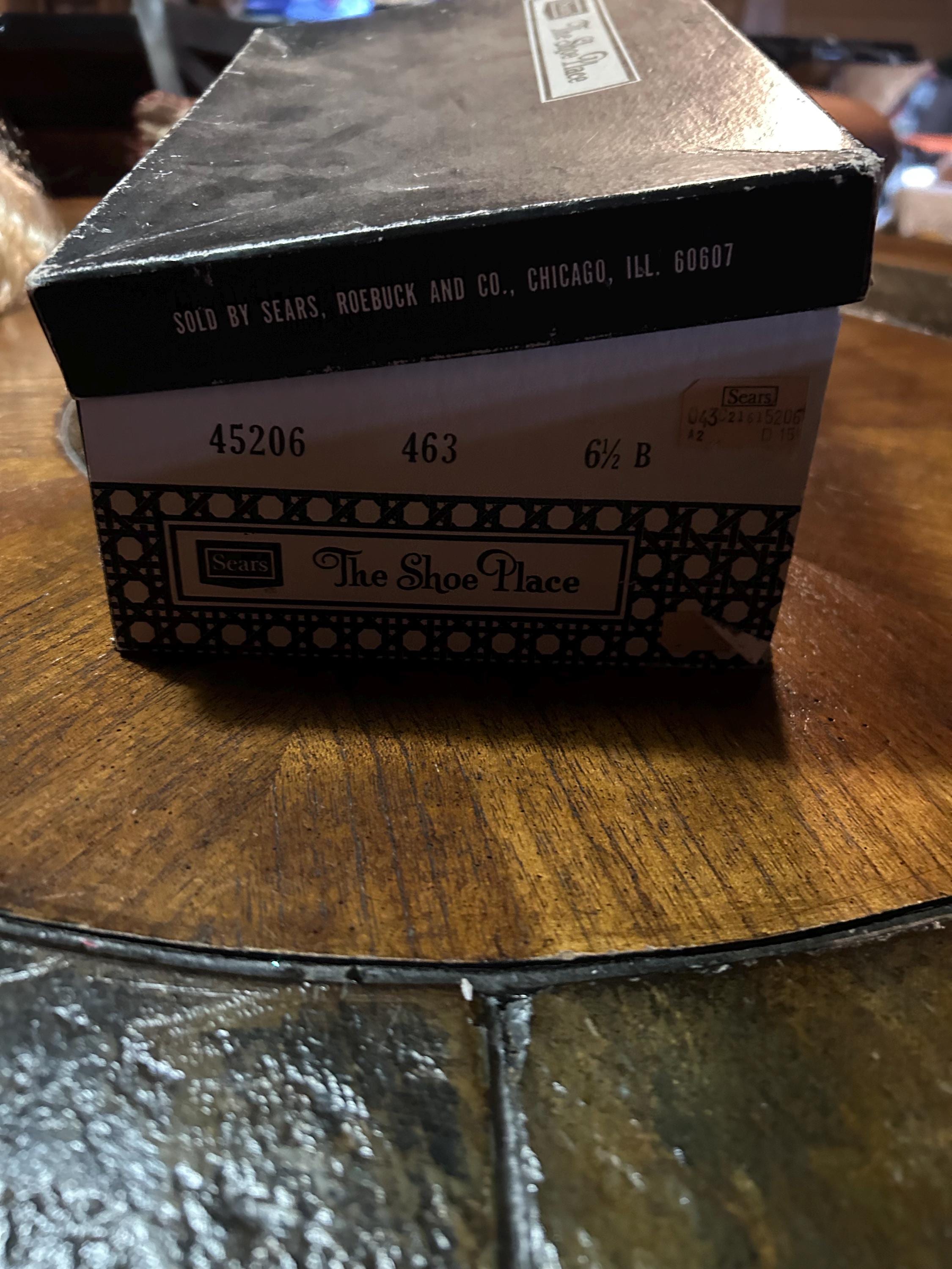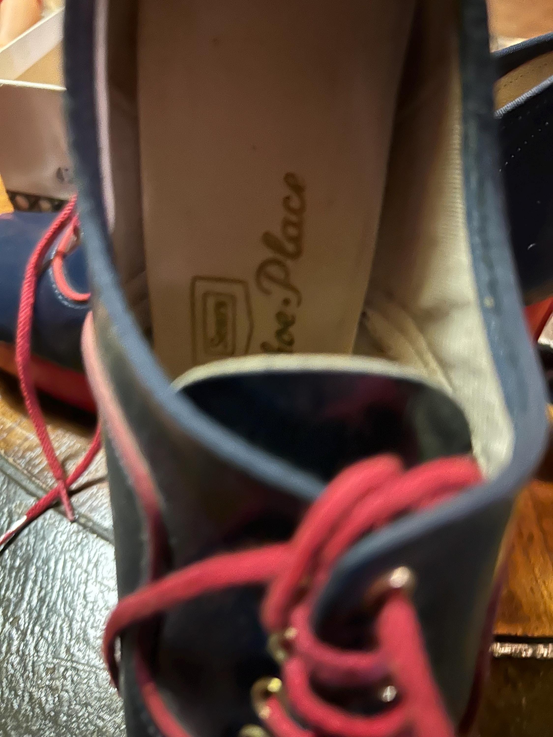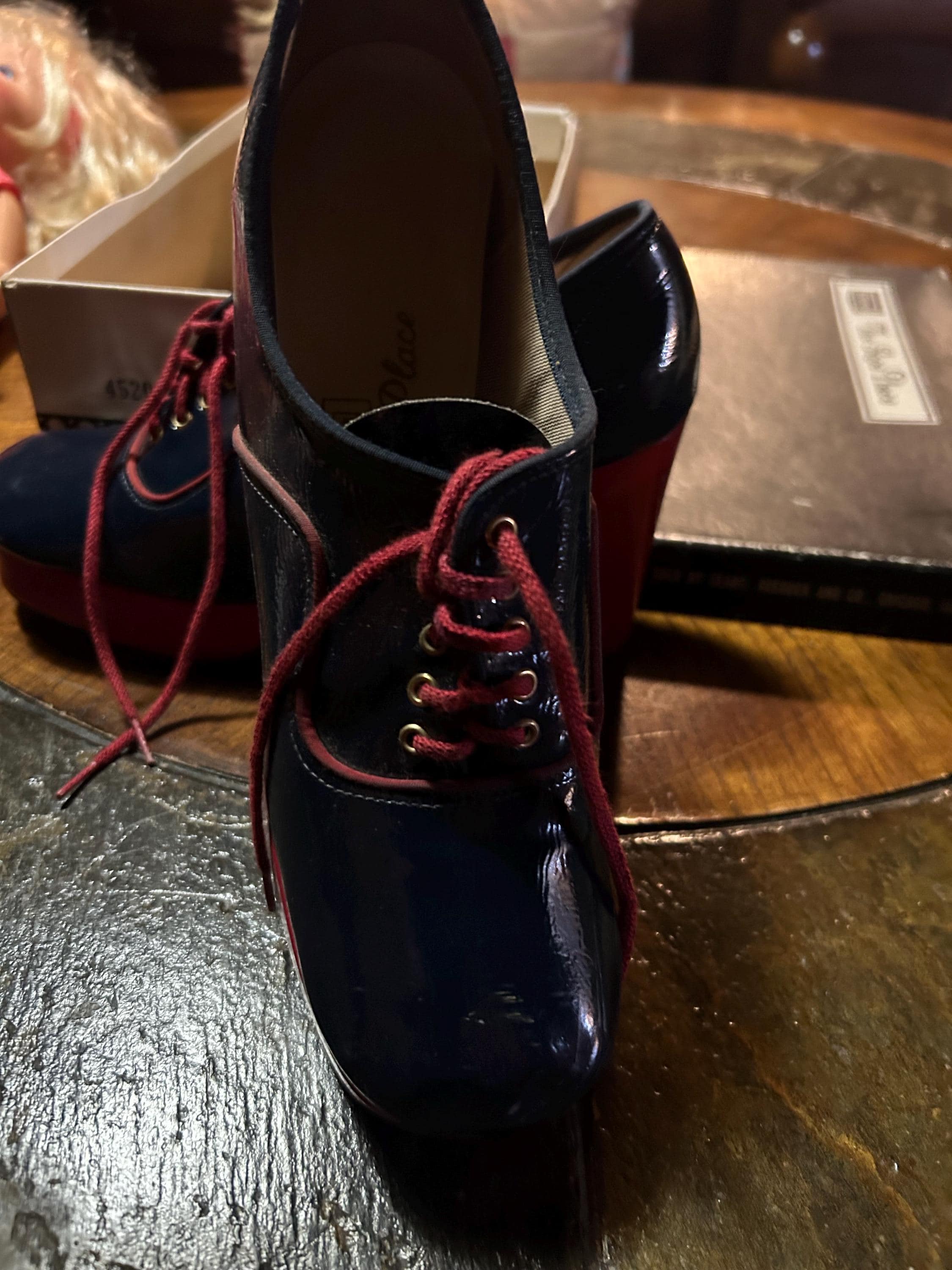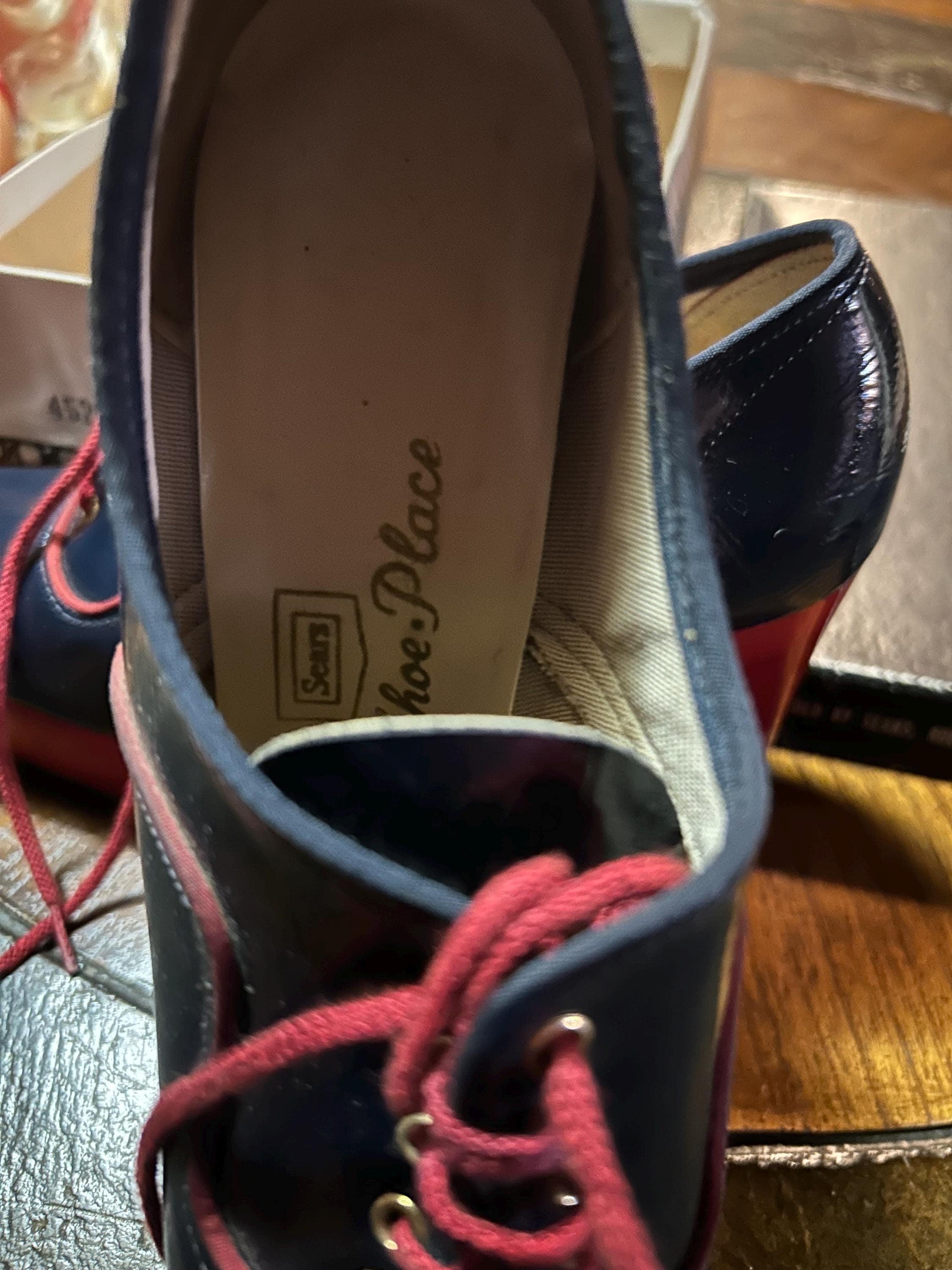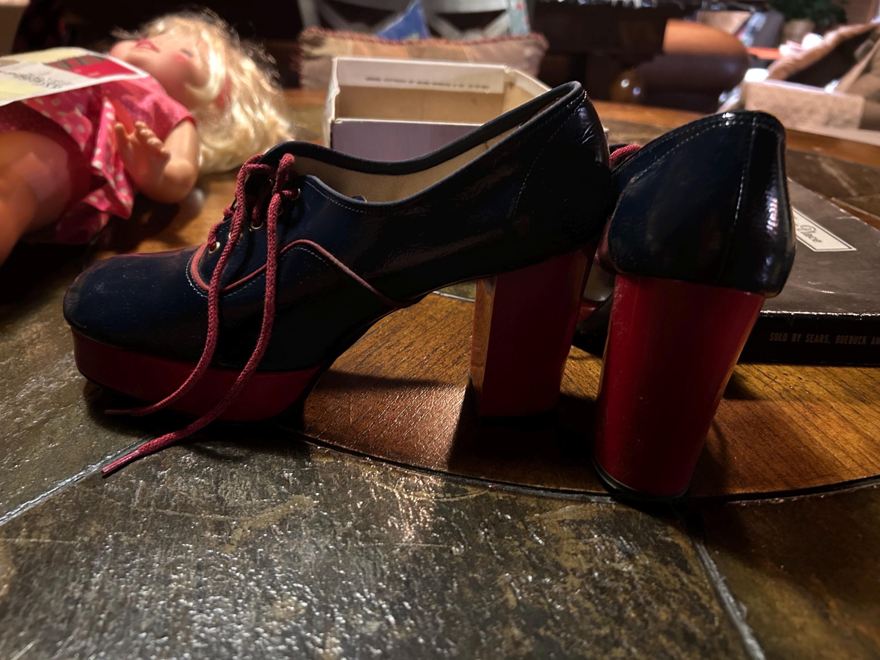 Amazing Vintage 1970's red, white and blue platform tie up shoes size 6 1/2B! Patent leather blue vamp with red top stitching and laces as well as heels. Great 3" heels and toe. Shoes have a tie up center and hail from Sears in the original box.