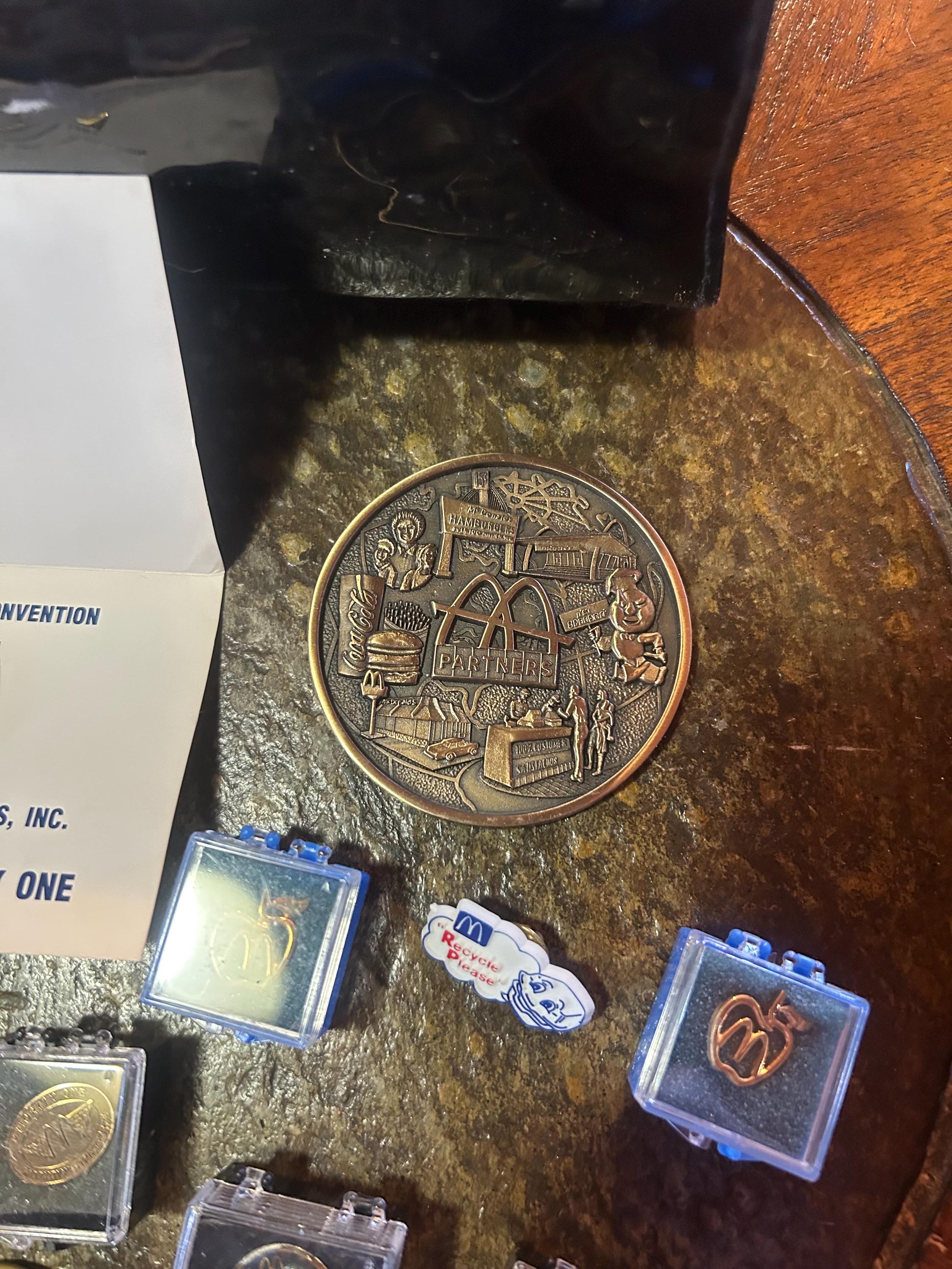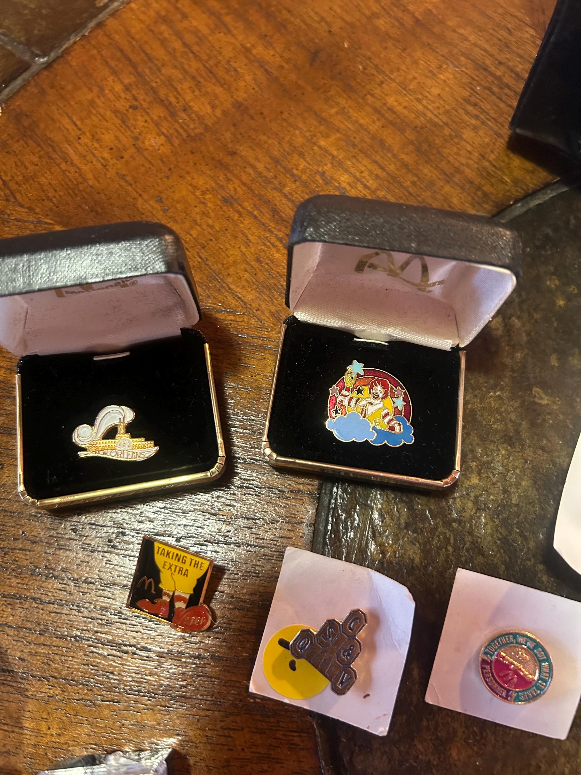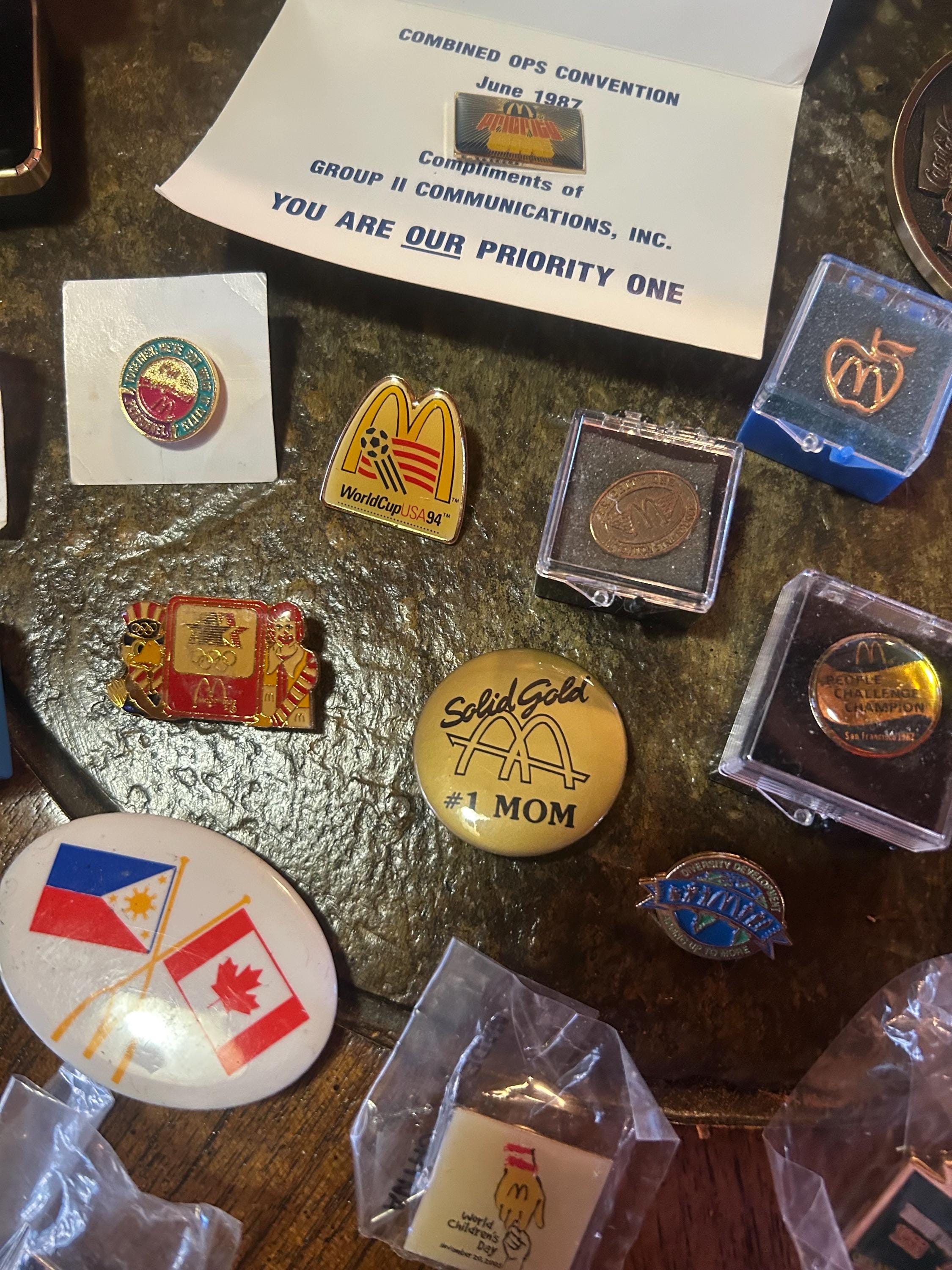 Vintage mostly 1980's McDonalds memorabilia; including top handled tote bag, souvenir pins(different types), buttons. Listing includes all. Please see shop for vintage employee hats.